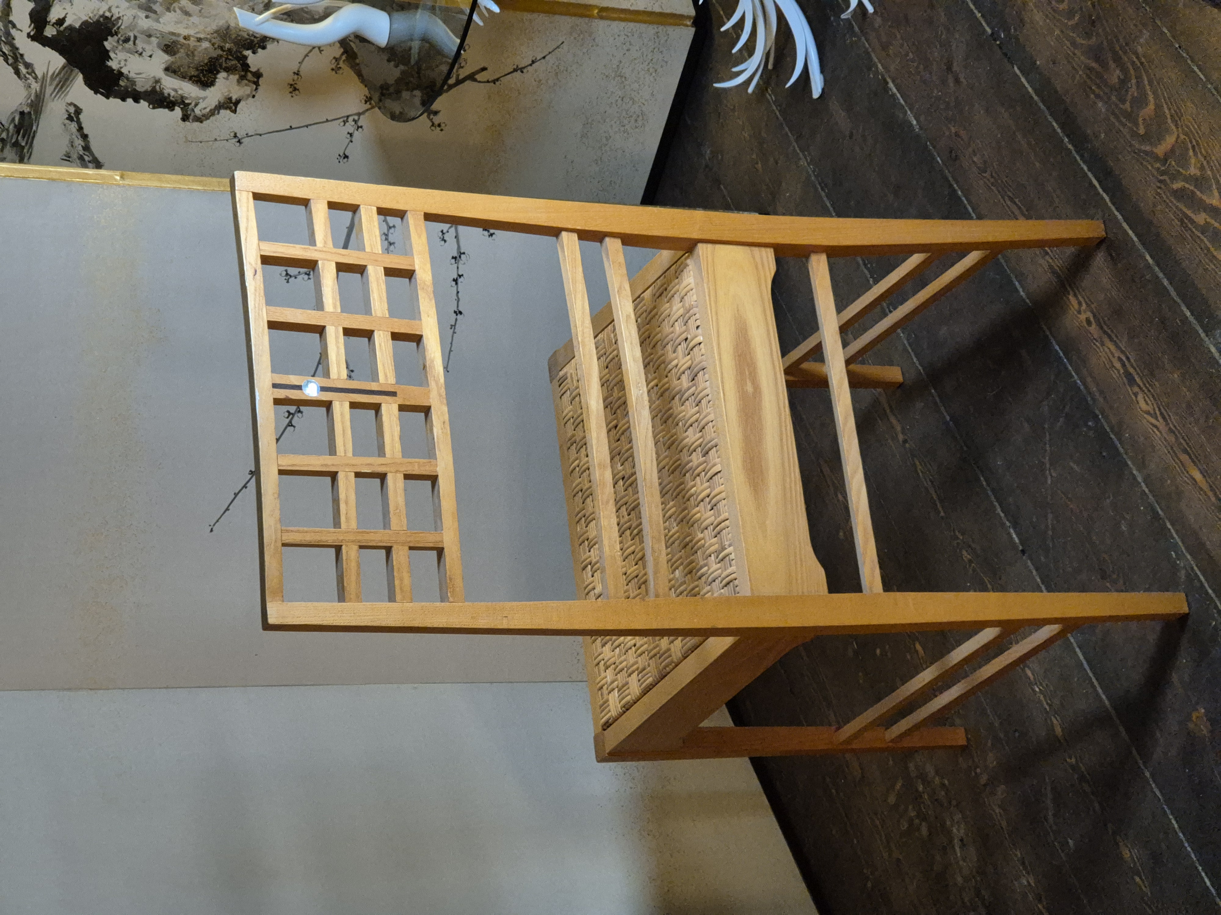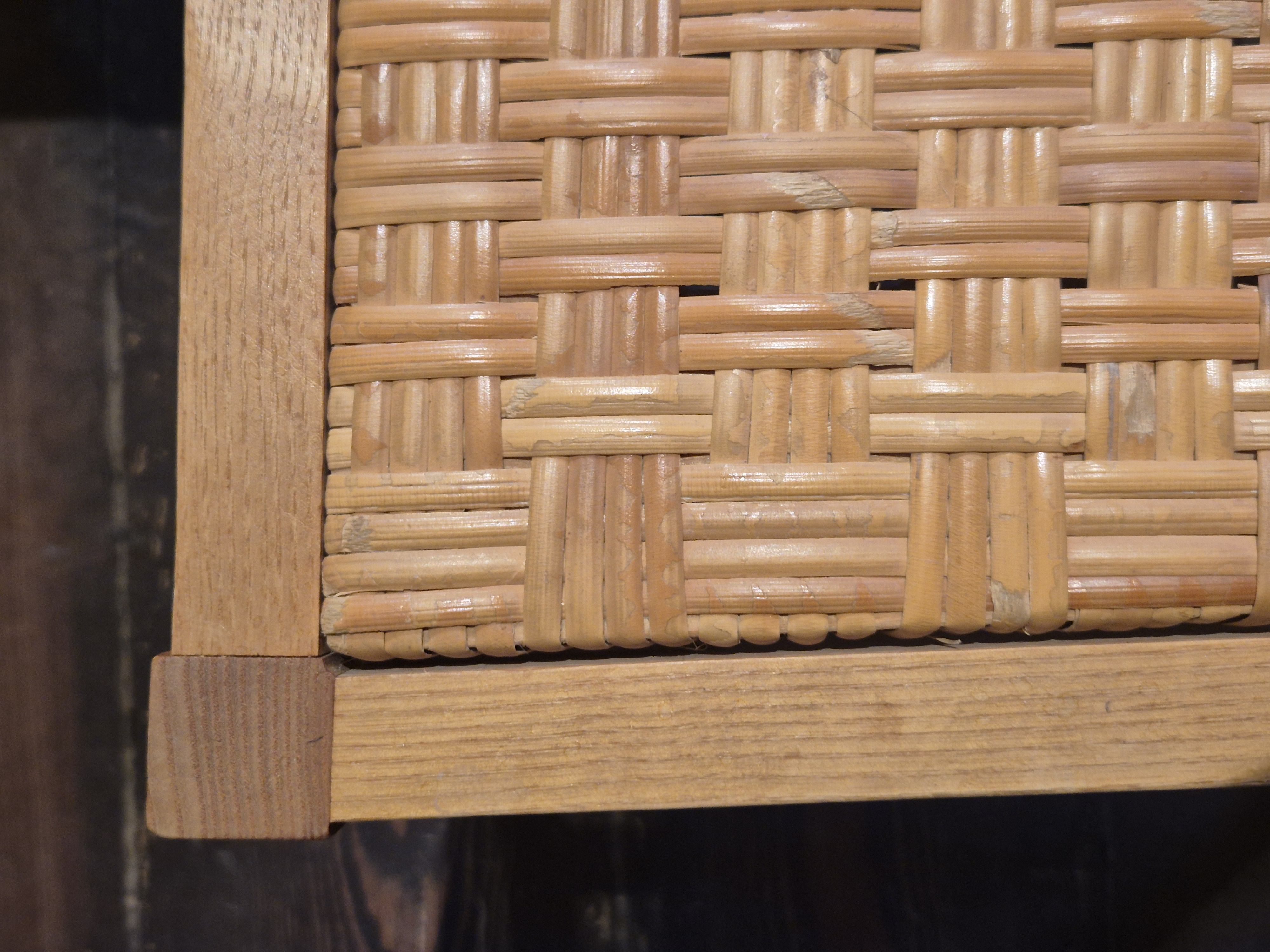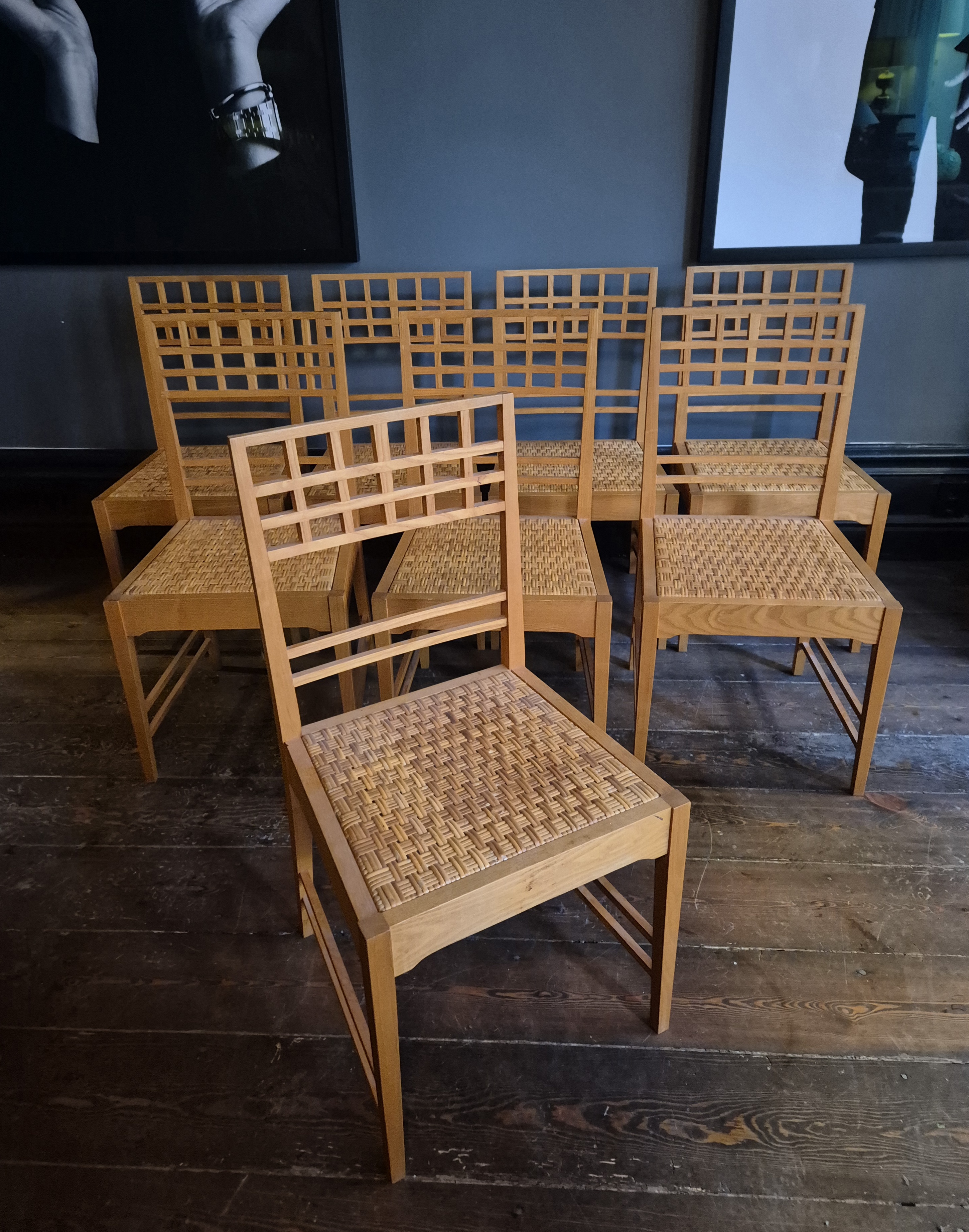 Rare stylish chairs, a set of eight, in ash, back rest with details of mother-of-pearl and ebony. Attributed to Swedish designer and interior architect Erik Chambert (1907-1988). Swedish Modern, mid-1900s. Seatings with rattan. Beautiful, straight geometric lines, sculptural pieces which stand out for their sleek design and made by true workmanship expertis. Mainly wooden joints, inlay of mother-of-pearl and high-quality hardwoods was repeated in many of Chamberts furniture designs. In good condition, smaller signs of age and wear. One seat has been replaced with new rattan and few seats (4) have been replaced partially with new rattan by professional weaver. The other seats are original in nice condition.
