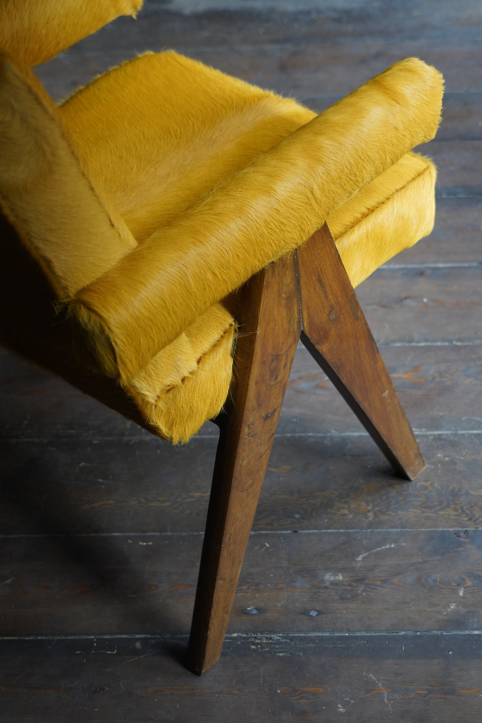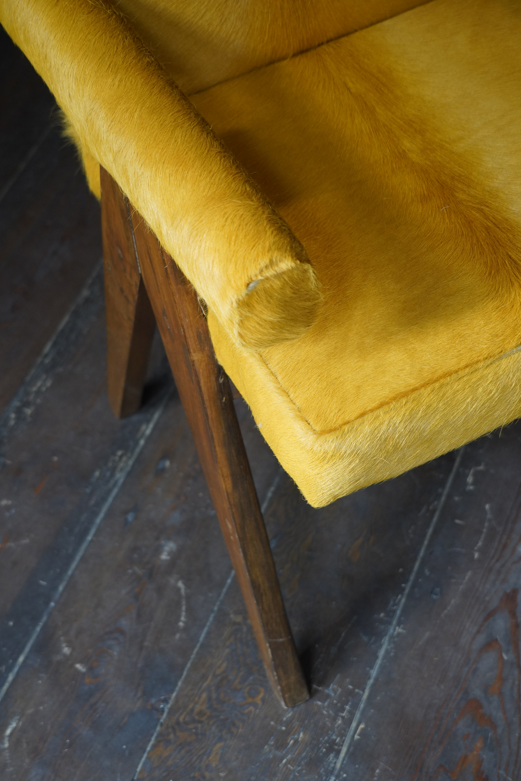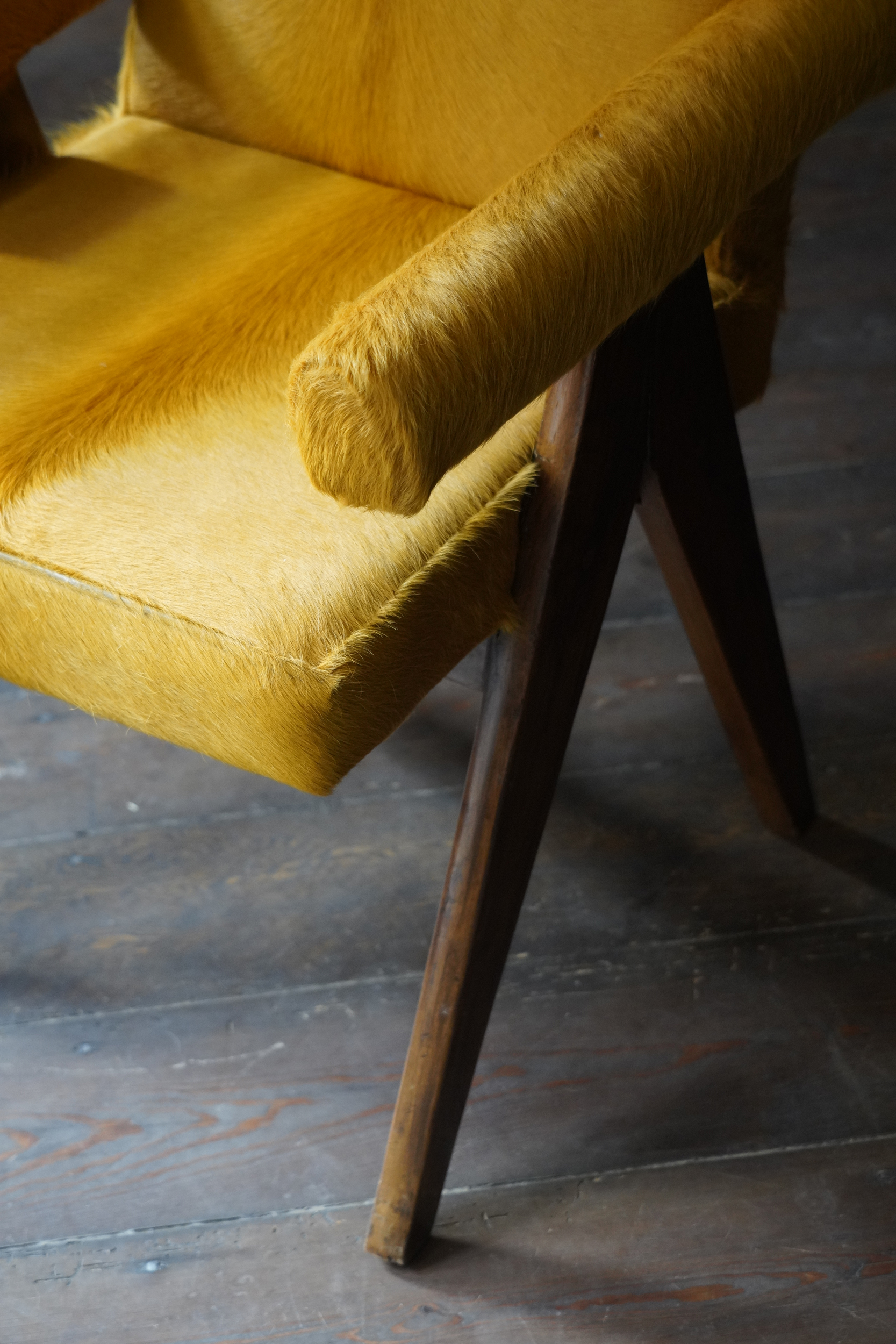 Pierre Jeanneret original SI-30-A armchairs in teak and reupholstered in yellow hide. Jeanneret was commissioned by the city of Chandigarh, India, to build and design for the Punjab University Administrative buildings and a few private residences. They were produced between circa 1952 and 1957. Provenance: Sourced from a private french collection by photographer Kalle Gustafsson / Galerie Mason Première.