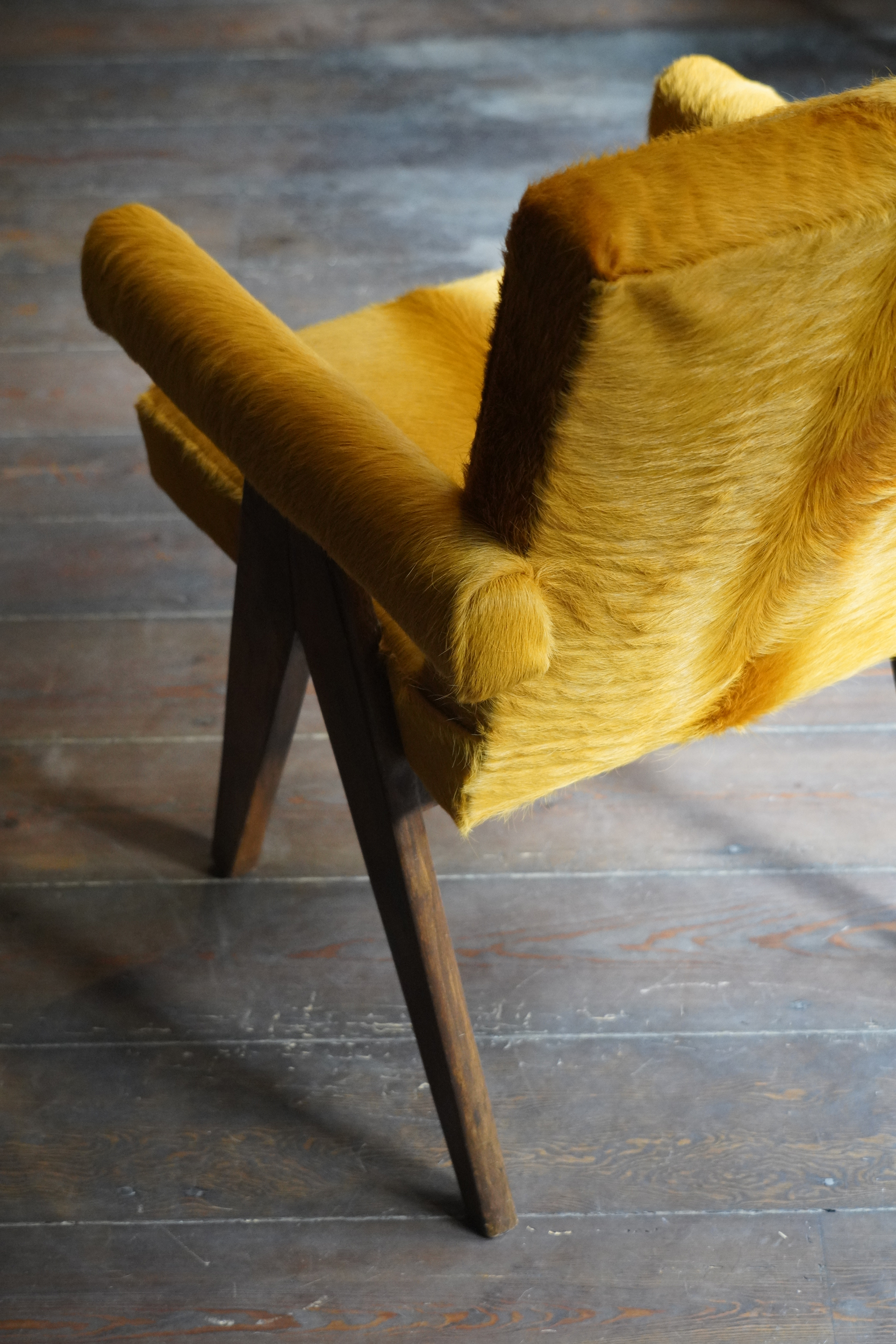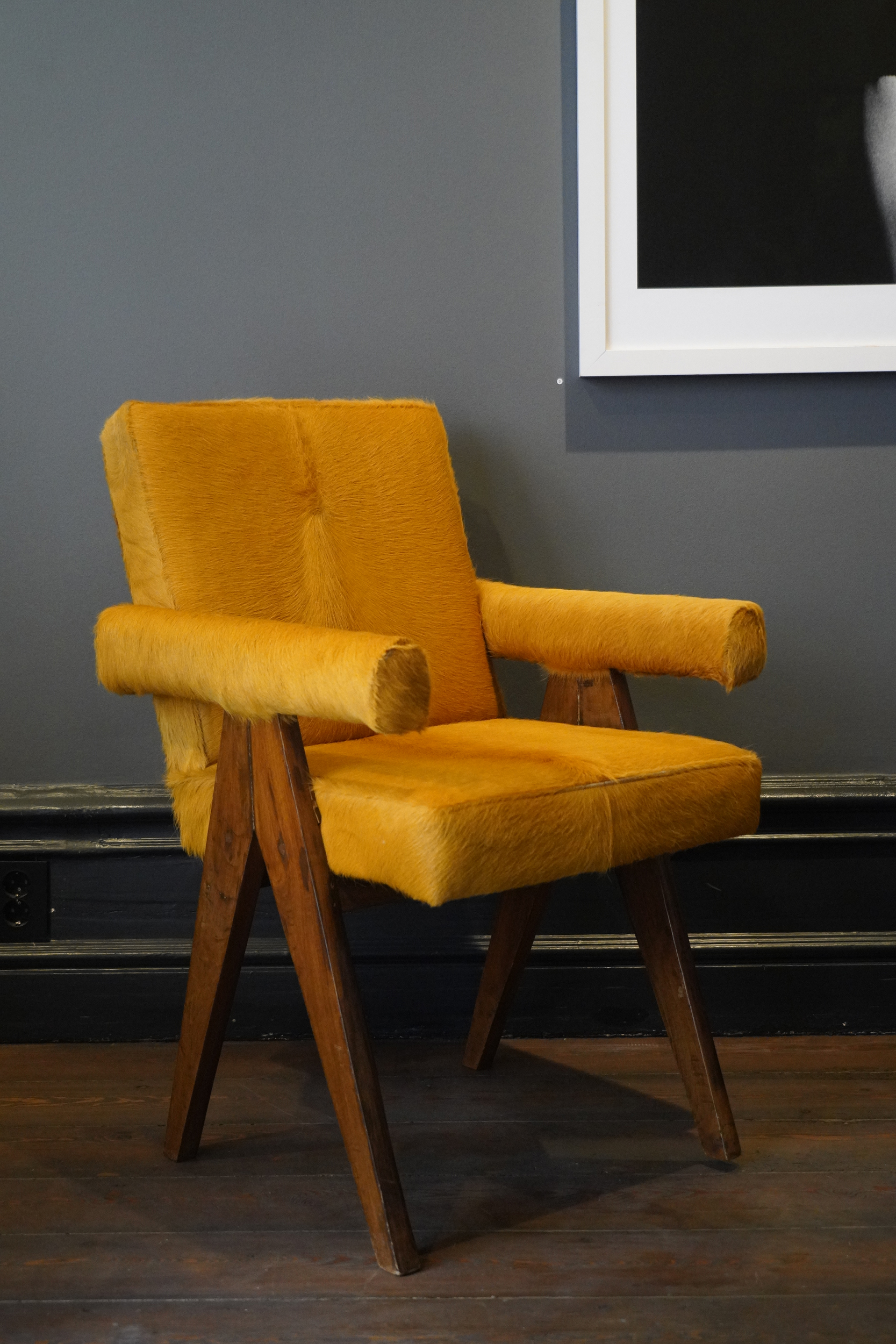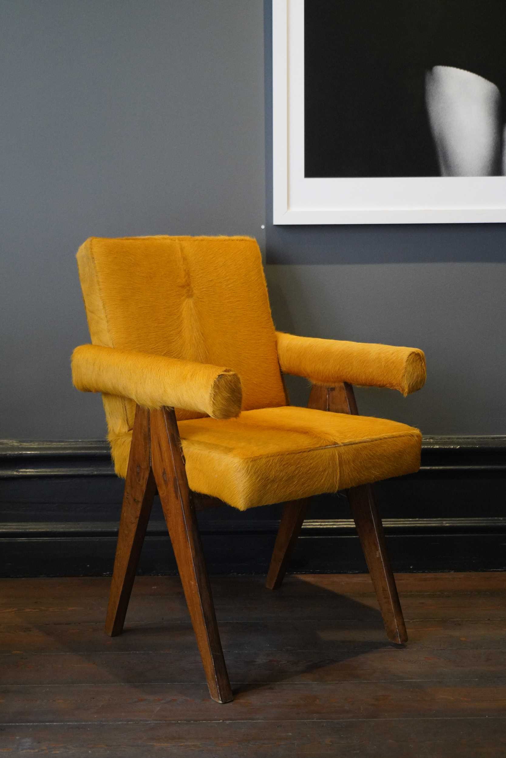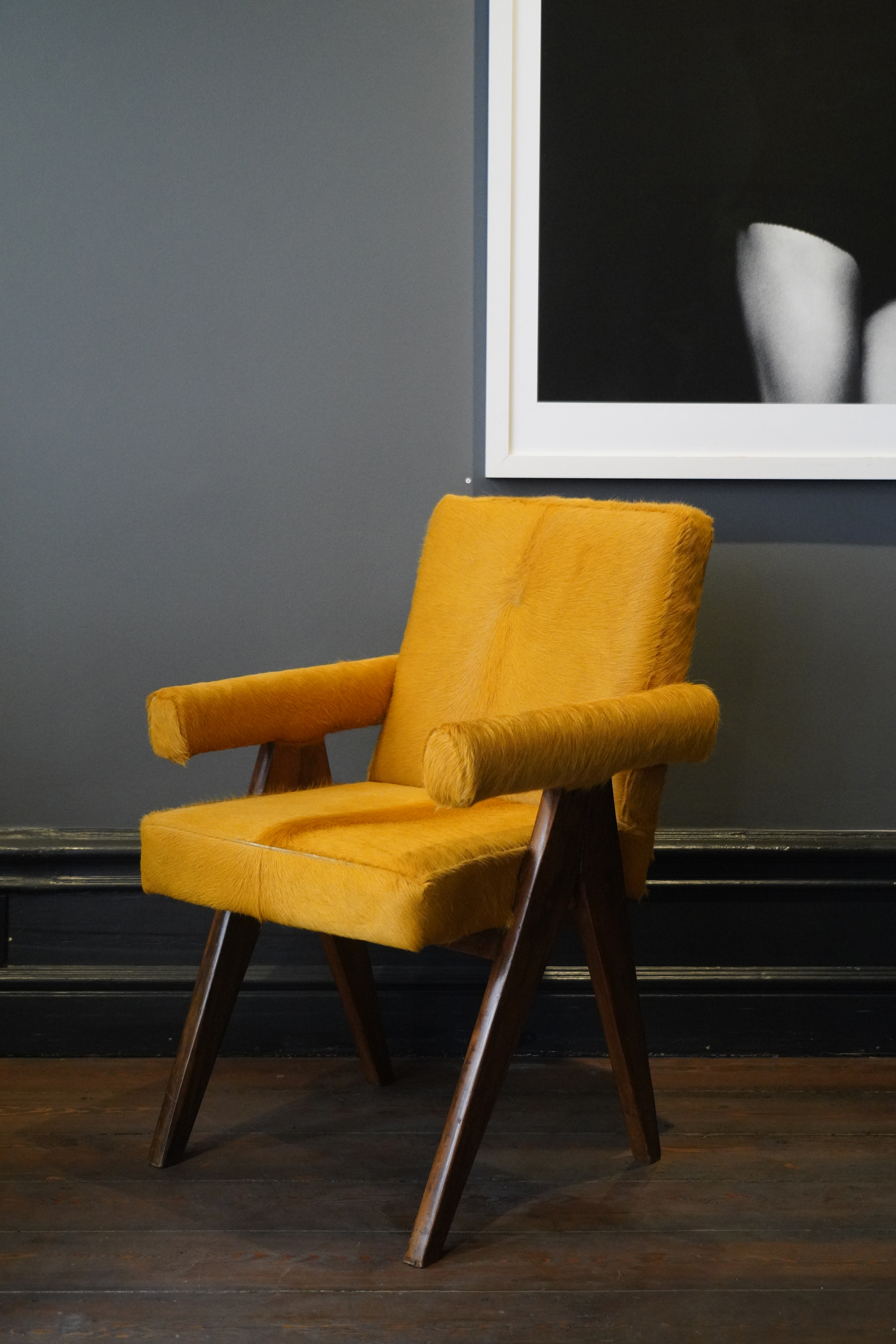 Pierre Jeanneret original SI-30-A armchairs in teak and reupholstered in yellow hide. Jeanneret was commissioned by the city of Chandigarh, India, to build and design for the Punjab University Administrative buildings and a few private residences. They were produced between circa 1952 and 1957. Provenance: Sourced from a private french collection by photographer Kalle Gustafsson / Galerie Mason Première.